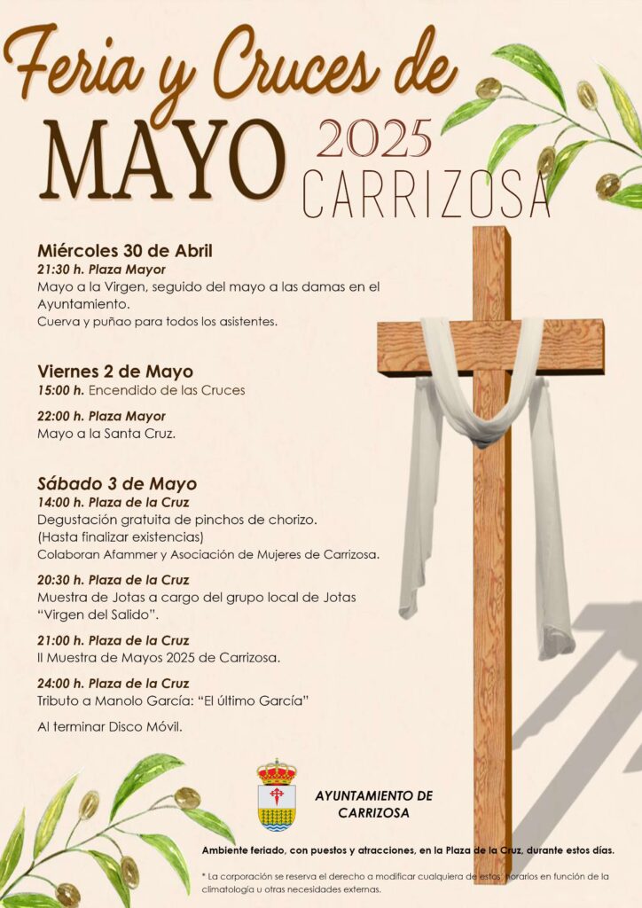 Programa de nuestra Fiesta de Cruces y Mayos de Carrizosa, que tendrá lugar del 30 de abril al 4 de mayo